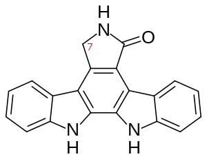 Staurosporine (antibiotic AM-2282 or STS) is a natural product originally isolated in 1977 from the bacterium Streptomyces staurosporeus.[1] It was the first of over 50 alkaloids that were discovered to share this type of bis-indole chemical structure. The chemical structure of staurosporine was elucidated by X-ray crystalography in 1994.[2]
