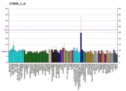 Tankyrase, also known as tankyrase 1, is an enzyme that in humans is encoded by the TNKS gene.[5][6][7] It inhibits the binding of TERF1 to telomeric DNA.[8] Tankyrase attracts substantial interest in cancer research through its interaction with AXIN1 and AXIN2, which are negative regulators of pro-oncogenic β-catenin signaling. Importantly, activity in the β-catenin destruction complex can be increased by tankyrase inhibitors and thus such inhibitors are a potential therapeutic option to reduce the growth of β-catenin-dependent cancers.[9]