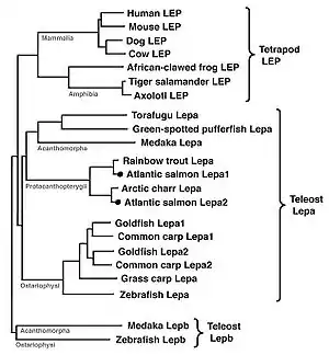 There are two closely related lep paralogues in Atlantic salmon (Salmo salar).[6] A single lep gene has been documented for green-spotted pufferfish (Tetraodon nigroviridis),[5] rainbow trout (Oncorhynchus mykiss),[7] Arctic charr (Salvelinus alpinus),[8] silver carp (Hypophthalmichthys molitrix), and grass carp (Ctenopharyngodon idellus).[9] In other species there are reports of two closely related lep paralogues, including common carp (Cyprinus carpio)[10] and Atlantic salmon.[6] More distantly related lep genes have been found in medaka (Oryzias latipes)[11] and zebrafish (Danio rerio).[12] At least 2 leptin genes (lepa and lepb) exist in the crown-clade (Fig. 1).[5][10][11][12] Early findings have shown that lepa and lepb share low interspecies aa identity, and are argued to have arisen through whole genome duplication,[5] which occurred early in the teleost lineage.[13] The duplicity of genes has been described for Atlantic salmon, Japanese medaka, common carp and zebrafish.[6][10][11][12] Both lep paralogues[6] cluster with lepa, and therefore suggest that at least one or more form (lepb) may exist in this species, since it is tetraploid.[14] However, previous attempts using genomic synteny have only found the putative genomic duplicates in medaka and zebrafish paralogue.[11][12] Currently it remains unclear, whether lepb exists in other teleosts due to the degenerative nature of this paralogue.