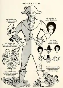 The Kallikak Family: A Study in the Heredity of Feeble-Mindedness was a 1912 book by the American psychologist and eugenicist Henry H. Goddard, dedicated to his patron Samuel Simeon Fels.[1] Supposedly an extended case study of Goddard’s for the inheritance of "feeble-mindedness", a general category referring to a variety of mental disabilities including intellectual disability, learning disabilities, and mental illness, the book is noted for factual inaccuracies that render its conclusions invalid. Goddard believed that a variety of mental traits were hereditary and that society should limit reproduction by people possessing these traits.