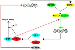 The mammalian TTFL model contains many components that are homologs of the ones found in Drosophila. The way the mammalian system works is that BMAL1 forms a heterodimer with CLOCK to initiate transcription of mPer and cryptochrome (cry). There are three paralogs, or historically similar genes that now appear as a duplication, of the period gene in mammals listed as mPer1, mPer2, and mPer3. There are also two paralogs of cryptochrome in mammals. PER and CRY proteins form a heterodimer, and PER's phosphorylation by CK1δ and CK1ε regulates the localization of the dimer to the nucleus. In the nucleus, PER-CRY negatively regulates the transcription of their cognate genes by binding BMAL1-CLOCK and causing their release from the E-box promoter.[8]