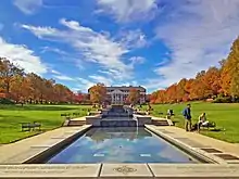 On March 6, 1856, the forerunner of today's University of Maryland was chartered as the Maryland Agricultural College.[21] Two years later, Charles Benedict Calvert (1808–1864), a future U.S. Representative (Congressman) and descendant of the first Lord Baltimore, purchased 420 acres (1.7 km2) of the Riversdale Mansion estate nearby today's College Park, Maryland.[22] Later that year, Calvert founded the school and was the acting president from 1859 to 1860.[23] On October 5, 1859, the first 34 students entered the Maryland Agricultural College.[1] The school became a land grant college in February 1864.[1]