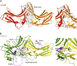 Vps26 is a 38-kDa subunit that has a two-lobed structure with a polar core that resembles the arrestin family of trafficking adaptor.[8][9] This fold consist of two related β-sandwich subdomains with a fibronectin type III domain topology. The two domains are joined together by a flexible linker and are closely associated by an unusual polar core. Arrestins are regulatory proteins known for connecting G-protein coupled receptors (GPCRs) to clathrin during endocytosis. They play many critical roles in cell signalling and membrane trafficking.[10] Both Vps26 and arrestins are composed of two structurally related β-sheet domains forming extensive interfaces with each other, using polar and electrostatic contacts to create interdomain interactions for ligand binding. However, there are significant structural differences between both Vps26 and arrestins. Vps26 protein has extended C-terminal tails that do not contain identifiable clathrin- or AP2-binding sequences, and therefore cannot form stable intramolecular contacts with clathrin and AP2, which has been observed for arrestins. Moreover, Vps26 does not have similar sequences as arrestins for GPCR and phospholipid interactions.[11]