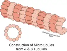 XMAP215/Dis1 family proteins promote both growth and reduction of microtubule length, depending on the concentration of free tubulin; this is known as dynamic instability.[1] Protein behavior is also cell-cycle dependent. Reducing ch-TOG expression leads to improper alignment of the chromosomes during metaphase.[7] One study suggests that in Schizosaccharomyces pombe, the protein Cdc2 regulates Dis1 through phosphorylation and dephosphorylation during metaphase and anaphase. Phosphorylating Dis1 leads to localization at the kinetochores during metaphase, whereas dephosphorylation during anaphase leads to an accumulation of Dis1 on microtubule spindles.[8] In Drosophila, the family member Mini spindles (Msps) is essential for maintaining the integrity of mitotic spindles, which are important for separating chromosomes during mitosis. Reducing Msps activity creates short microtubules, which describes the name of the gene.[9] Msps is also important during oogenesis. When oocytes are depleted of Msps expression, bicoid mRNA localization is less efficient during early stages of oogenesis, but then completely dispersed later in development.[10] Msps is not only responsible for transporting bicoid mRNA throughout the cell, but it also localizes mRNA to the anterior (head) end of the oocyte[10] Additionally, this gene is critical for the organization of tubular endoplasmic reticulum and in Exuperantia protein localization. Exuperantia is necessary for accumulating bicoid mRNA in the head region of the oocyte.[11] Another key function of XMAP215 in microtubule dynamics is in the regulation of axon guidance.[12] This is when microtubules extend into or retract from the axonal growth cone, which guides movement by receiving concentrated signaling cues.[13] In Drosophila, Msps promotes microtubule dynamics in axonal guidance at the embryonic ventral nerve cord midline.[14]