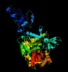 Protein ZGRF1 is a protein encoded in the human by the ZGRF1 gene also known as C4orf21, that has a weight of 236.6 kDa.[5] The ZGRF1 gene product localizes to the cell nucleus and promotes DNA repair by stimulating homologous recombination.[6] This gene shows relatively low expression in most human tissues, with increased expression in situations of chemical dependence. ZGRF1 is orthologous to nearly all eukaryotes. Functional domains of this protein link it to a series of helicases, most notably the AAA_12 and AAA_11 domains.