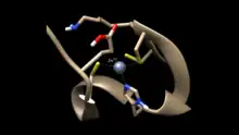NCp7 is a 55-amino acid protein that is highly basic and consists of two gag-knuckle motifs. These motifs contain two peptide units of Cys-X2-Cys-X4-His-X4-Cys (CCHC), where the X represents a substituted amino acid, that make up the zinc (II) ion binding sites.[4][5] The binding of zinc (II) in the CCHC binding site is necessary for the domain to be functional and for the stabilization of the conformation of the structure, allowing the NCp7 to carry out the processes required for HIV replication. Since the CCHC binding site is mutation resistant and involved in the replication of HIV-1, it makes a prime candidate for the prevention of HIV through zinc ejectors.[5] By inhibiting the function of NCp7, the viral replication is affected and a non-functional virus that is unable to infect its host is produced.[6]