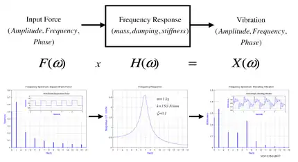 For example, calculating the FRF for a mass–spring–damper system with a mass of 1 kg, spring stiffness of 1.93 N/mm and a damping ratio of 0.1. The values of the spring and mass give a natural frequency of 7 Hz for this specific system. Applying the 1 Hz square wave from earlier allows the calculation of the predicted vibration of the mass. The figure illustrates the resulting vibration. It happens in this example that the fourth harmonic of the square wave falls at 7 Hz. The frequency response of the mass–spring–damper therefore outputs a high 7 Hz vibration even though the input force had a relatively low 7 Hz harmonic. This example highlights that the resulting vibration is dependent on both the forcing function and the system that the force is applied to.