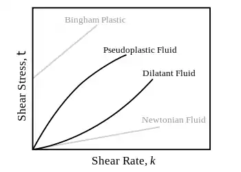 Depending on the change of strain rate versus stress inside a material, the viscosity can be categorized as having a linear, non-linear, or plastic response. When a material exhibits a linear response it is categorized as a Newtonian material. In this case the stress is linearly proportional to the strain rate. If the material exhibits a non-linear response to the strain rate, it is categorized as non-Newtonian fluid. There is also an interesting case where the viscosity decreases as the shear/strain rate remains constant. A material which exhibits this type of behavior is known as thixotropic. In addition, when the stress is independent of this strain rate, the material exhibits plastic deformation.[1] Many viscoelastic materials exhibit rubber like behavior explained by the thermodynamic theory of polymer elasticity.