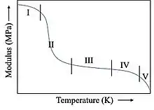 • Region I: Glassy state of the polymer is presented in this region. The temperature in this region for a given polymer is too low to endow molecular motion. Hence the motion of the molecules is frozen in this area. The mechanical property is hard and brittle in this region.[23]