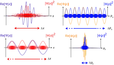 The real parts of position wave function Ψ(x) and momentum wave function Φ(p), and corresponding probability densities |Ψ(x)|2 and |Φ(p)|2, for one spin-0 particle in one x or p dimension. The colour opacity of the particles corresponds to the probability density (not the wave function) of finding the particle at position x or momentum p.