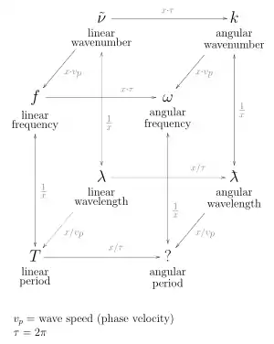 in which wavelength and wavenumber are related to velocity and frequency as: