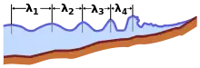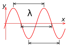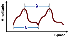 In physics and mathematics, wavelength or spatial period of a wave or periodic function is the distance over which the wave's shape repeats.[1][2] In other words, it is the distance between consecutive corresponding points of the same phase on the wave, such as two adjacent crests, troughs, or zero crossings. Wavelength is a characteristic of both traveling waves and standing waves, as well as other spatial wave patterns.[3][4] The inverse of the wavelength is called the spatial frequency. Wavelength is commonly designated by the Greek letter lambda (λ). The term "wavelength" is also sometimes applied to modulated waves, and to the sinusoidal envelopes of modulated waves or waves formed by interference of several sinusoids.[5]