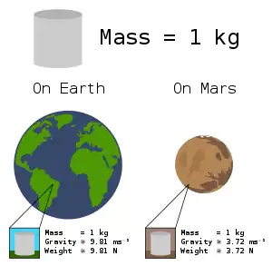 In modern scientific usage, weight and mass are fundamentally different quantities: mass is an intrinsic property of matter, whereas weight is a force that results from the action of gravity on matter: it measures how strongly the force of gravity pulls on that matter. However, in most practical everyday situations the word "weight" is used when, strictly, "mass" is meant.[8][21] For example, most people would say that an object "weighs one kilogram", even though the kilogram is a unit of mass.