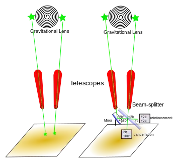 The cosmic experiment envisioned by Wheeler could be described either as analogous to the interferometer experiment or as analogous to a double-slit experiment. The important thing is that by a third kind of device, a massive stellar object acting as a gravitational lens, photons from a source can arrive by two pathways. Depending on how phase differences between wavefunction pairs are arranged, correspondingly different kinds of interference phenomena can be observed. Whether to merge the incoming wavefunctions or not, and how to merge the incoming wavefunctions can be controlled by experimenters. There are none of the phase differences introduced into the wavefunctions by the experimental apparatus as there are in the laboratory interferometer experiments, so despite there being no double-slit device near the light source, the cosmic experiment is closer to the double-slit experiment. However, Wheeler planned for the experiment to merge the incoming wavefunctions by use of a beam splitter.[18]