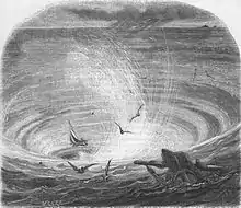 The fictional depictions of the Moskstraumen by Edgar Allan Poe, Jules Verne, and Cixin Liu describe it as a gigantic circular vortex that reaches the bottom of the ocean, when in fact it is a set of currents and crosscurrents with a rate of 18 km/h (11 mph).[9] Poe described this phenomenon in his short story "A Descent into the Maelström", which in 1841 was the first to use the word maelstrom in the English language;[8] in this story related to the Lofoten Maelstrom, two fishermen are swallowed by the maelstrom while one survives.[10]