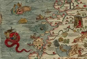 Moskstraumen or Moske-stroom is an unusual system of whirlpools in the open seas in the Lofoten Islands off the Norwegian coast.[6] It is the second strongest whirlpool in the world with flow currents reaching speeds as high as 32 km/h (20 mph).[4] This is supposedly the whirlpool depicted in Olaus Magnus's map, labeled as "Horrenda Caribdis" (Charybdis).[7]