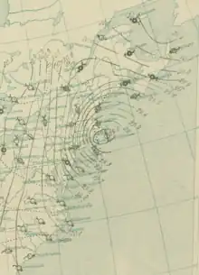 Winds are depicted as blowing from the direction the barb is facing. Therefore, a northeast wind will be depicted with a line extending from the cloud circle to the northeast, with flags indicating wind speed on the northeast end of this line.[26] Once plotted on a map, an analysis of isotachs (lines of equal wind speeds) can be accomplished. Isotachs are particularly useful in diagnosing the location of the jet stream on upper-level constant pressure charts, and are usually located at or above the 300 hPa level.[27]