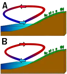 Wind shear, sometimes referred to as wind gradient, is a difference in wind speed and direction over a relatively short distance in the Earth's atmosphere.[60] Wind shear can be broken down into vertical and horizontal components, with horizontal wind shear seen across weather fronts and near the coast,[61] and vertical shear typically near the surface,[62] though also at higher levels in the atmosphere near upper level jets and frontal zones aloft.[63]