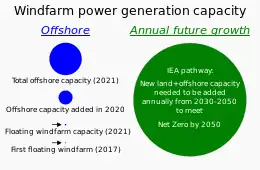 As of November 2021, the Hornsea Wind Farm in the United Kingdom is the largest offshore wind farm in the world at 1,218 MW.[38]