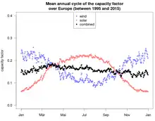 Solar power tends to be complementary to wind.[73][74] On daily to weekly timescales, high-pressure areas tend to bring clear skies and low surface winds, whereas low-pressure areas tend to be windier and cloudier. On seasonal timescales, solar energy peaks in summer, whereas in many areas wind energy is lower in summer and higher in winter.[upper-alpha 1][75] Thus the seasonal variation of wind and solar power tend to cancel each other somewhat.[72] Wind hybrid power systems are becoming more popular.[76]