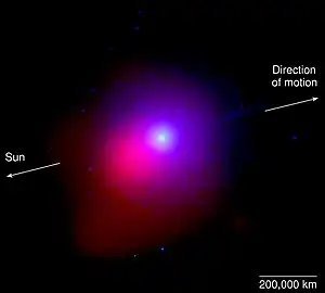 NASA's Swift Gamma-Ray Burst Mission satellite was monitoring Comet Lulin as it closed to 63 Gm of Earth. For the first time, astronomers can see simultaneous UV and X-ray images of a comet. "The solar wind—a fast-moving stream of particles from the sun—interacts with the comet's broader cloud of atoms. This causes the solar wind to light up with X-rays, and that's what Swift's XRT sees", said Stefan Immler, of the Goddard Space Flight Center. This interaction, called charge exchange, results in X-rays from most comets when they pass within about three times Earth's distance from the Sun. Because Lulin is so active, its atomic cloud is especially dense. As a result, the X-ray-emitting region extends far sunward of the comet.[58]