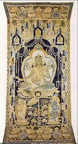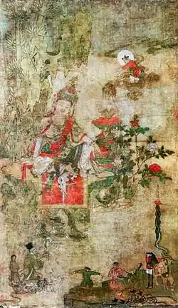"In Chinese Buddhism, Avalokiteshvara is often considered in a female form and know as Guanyin. In this painting on silk [on the right], she is shown sitting in western pure land (heaven). What is interesting is that at the bottom, some Tanguts are shown as playing musical instruments and dancing. There is pole on right that connects heaven with earth. On left, the figure in black cap is the emperor, who has died and is going to heaven. His grave also is shown next to him. In the upper right, the dead man is shown again, this time reborn as a boy, reaching out his hands to the Bodhisattva in prayer."[3]