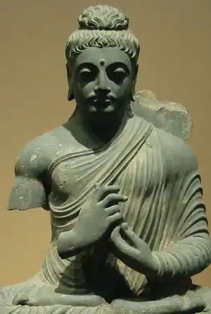 The Vajra mudrā "thunder gesture" exhibited by the cyan colored statue on the left is the gesture of knowledge.[9]