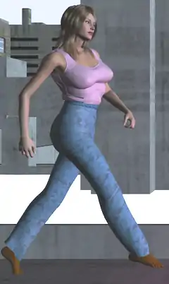 Key frames apply to selected elements of the scene. While the frame indicator on the timeline is still at zero, make sure your human character is selected and click on the "add key frame" button of the timeline pane (the 9th button from the right, it has a white "+" sign superimposed on a black key). Move the current frame to frame 30, the middle frame of the animation. For this frame, the goal is to show the walking character with the other foot forward, as shown in Figure 2 (above, left). DAZ Studio has a feature that makes this easy.