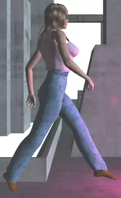 Bending limbs. Try bending the elements of the left leg to make a more realistic appearance for that leg as it moves forward (Figure 3 shows an example). Make use of Chapter 14 in the DAZ Studio manual if you are new to modifying the angles of bones in limbs. Again check that your figure is not sinking into the floor and click the "make key frame" button when you are done adjusting frame 15.
