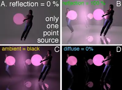 The human figure and the cat have surfaces for which the reflection channel is set to 0%. For this example, the surfaces of the walls and floor were set to have the reflection channel set to 100%. The name "reflection channel" is somewhat misleading because the "diffuse", "specular" and "ambient" channels also allow objects in the scene to be rendered as they would appear because of reflecting light. In terms of physics, there is a distinction between Diffuse reflection and Specular reflection. The distinction is in the organization of the reflected light that leaves the surface. If there is a large amount of specular reflection then the organization and coherence of the original light falling on the object is retained in the reflected light. If there is mostly diffuse reflection then the directions of reflected photons are not consistent with the original directions of the photons that fell on the surface and it is not possible to obtain an image or coherent view (what we typically call a "reflection") of the original light source from the reflected photons. With diffuse reflection, the surface of the object scatters the reflected light in many different directions.