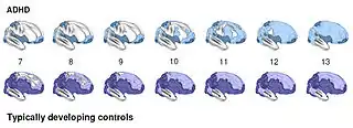 A timeline showing expected cortical development (purple) compared with individuals with ADHD (blue)