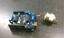 Dcalderon continued to work with the DC Motors. This time he switched over to working with motor shields and the Arduino. He added motor shields to the Arduino tutorial page. He then started to connect the DC Motor to the motor shield which is mounted on the Arduino and tried to use one of the code sketches that ladyada.net offers. This resulted in a failure do to that the arduino software did not recognize the library of words the code was using since it came from ladyada.net. Under Downloads of that page though, this member downloaded the libraries and set them up together with the arduino software to see if that would help recognize the library but still this attempt ended up with more failures and frustration.