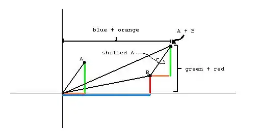 Below is a convenient depiction of bionic number addition. When we add bionic numbers, the shift of vector A is analogous of a shift of a length in adding real numbers along the number line.