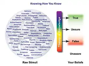 Our world is full of various stimuli that contend for our attention and masquerade as the truth. Unfortunately much of the information we are exposed to is unreliable and misleading. The diagram on the right illustrates our need to filter the raw stimuli we are exposed to in the world to arrive at our own beliefs. Our theory of knowledge is the process we use to analyze and integrate raw information sources into our beliefs about what is true, what is false, what we are unsure of, and what we are unaware of.