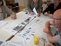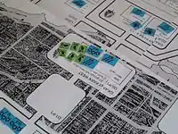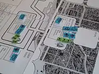 The board is a depiction of central Chicago with particular reference to such parks as Grant Park where the protesters gathered. We created a double size photocopied version so that a group of us could gather around the board. This depiction is based in a series of interconnected locations, which provides a Point to Point Movement mechanic.