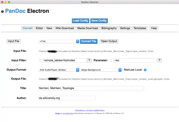 PanDocElectron is a tool to create Open Educational Resources (OER) from and for Wikipedia and Wikiversity. PanDocElectron is able to download wiki documents and create several other output formats from the wiki source. The main workflow for educators is: