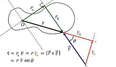 • is the torque caused by a force, F, exerted at a distance ,r, from the axis. The angle between r and F is θ.