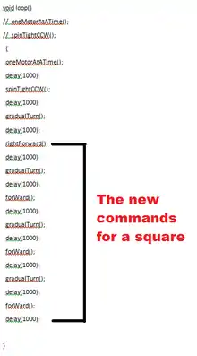 Copy the original code into a word document. Decide what you want in the new code. In the loop() part of the code, erase what you do not want. At the end, insert the new commands that will make a square. The new commands come from the graphic of the path. Each command is followed by a 1000 millisecond delay. After the loop comes the individual sections for each command. They're titled "void (insert name)". Keep only the commands that you will be using. Erase the rest of the sections. The final code The final code should look like this: