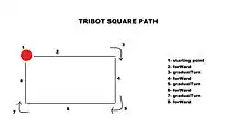 Envision what you want the Tribot to do. In this case, it needs to go in a square. A square looks like the graphic above. This new pattern begins with a starting point, then a forWard command from the point then a gradualTurn then forWard then gradualTurn then forWard then gradualTurn and lastly one more forWard command. Change the original