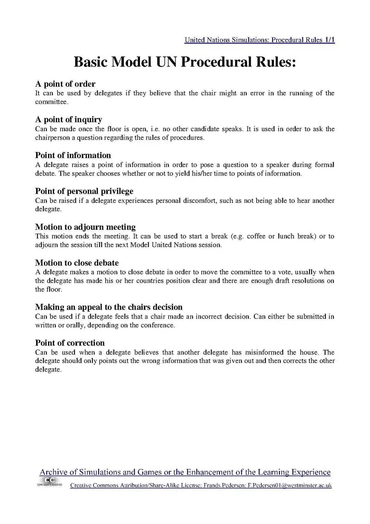 The lecturer/module leader will be chairing the debate (unless this task is delegated to a third person). He or she will also ensure participants adhere to the rules of procedure and keep their interventions within the agreed time limits. Placard: If more than one delegate represent one member state/country they should sit together and have a placard with their member state/country name visible in front of them. This placard will be needed and raised every time a delegate wishes to speak and for voting procedures.