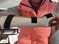 6) Now to create a pressure release point in the cast, cut out a small rectangle slightly longer then the length of the cut/scar of the patient form the surgery, now stick this foam over the wound (do not have direct contact to wound but have a type of covering to avoid this) attaching it with tape Fig 4, Now cover the arm in a stocking tying the distal end, having a hole for the thumb and hinging the proximal end to the clients shoulder or clothes to make the stocking taught. Refer to Fig 6.
