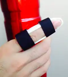 - • LTT finger splint covering palmer side of affected finger ending at MCP joint