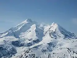 Glaciers and snowfields appear to be numerous in this late spring image on the left of Mount Redoubt.