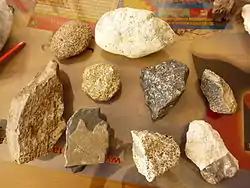 The image on the right shows a collection of various igneous rocks: from top left to bottom right these are: granodiorite, andesite, syenite, gabbro, rhyolite, basalt, granite and an ignimbrite (a collective term for a special type of volcaniclastic sediment).