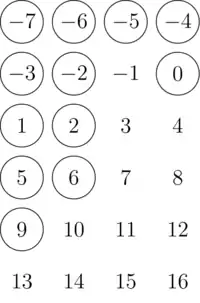 In the particular case that , so that is the standard copy of inside , the elements of may naturally be represented by abacus diagrams: the integers are arranged in an infinite strip of width n, increasing sequentially along rows and then from top to bottom; integers are circled if they lie directly above one of the window entries of the minimal coset representative. For example, the minimal coset representative is represented by the abacus diagram at right. To compute the length of the representative from the abacus diagram, one adds up the number of uncircled numbers that are smaller than the last circled entry in each column. (In the example shown, this gives .)[18]