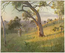 Fuller's paintings from this period included A Golden Hour, described by the National Gallery of Australia as "a masterpiece ... giving us a gentle insight into the people, places and times that make up our history".[1] The painting, an oil on canvas 109 cm (43 in) high and 135 cm (53 in) wide, portrays a woman and a man standing together in a rural setting in late afternoon, surrounded by grass, scattered gum trees, and Xanthorrhoea. When the painting was put up for sale in 2012, the auction house catalogue stated that it had been owned by William Ride, former director of the Western Australian Museum. It reported:
