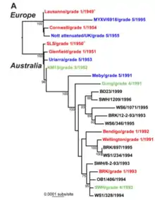 - 1 2 Kerr, Peter (2017). "Genomic and phenotypic characterization of myxoma virus from Great Britain reveals multiple evolutionary pathways distinct from those in Australia". PLOS Pathogens 13 (3): e1006252. doi:10.1371/journal.ppat.1006252. PMID 28253375. PMC 5349684. //www.ncbi.nlm.nih.gov/pmc/articles/PMC5349684/.