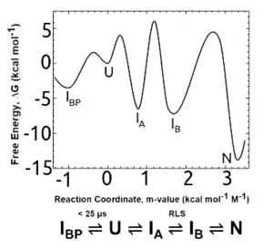 The conservation of the TIM barrel fold is mirrored by the conservation of its equilibrium and kinetic folding mechanisms in bacterial paralogs with phylogenetically distinct lineages. Chemical denaturation of several natural[36][37] and 2 designed TIM barrel variants[37] invariably involves a highly populated equilibrium intermediate. The kinetic intermediates that appear after dilution from highly denaturing solutions involve an early misfolded species that must at least partially unfold to access the productive folding pathway.[36][37] The rate-limiting step in folding is the closure of the 8-stranded β-barrel, with the preceding, open barrel form corresponding to the equilibrium intermediate(Figure 5).[38] Native-centric molecular dynamics simulations recapitulate the experimental results and point the way to testable computational models for complex folding mechanisms.[39]