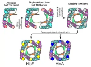 The predominant theory for TIM barrel evolution involves gene duplication and fusion, starting with a half- barrel that eventually formed a full TIM barrel. Multiple studies support the theory of divergent evolution from a single ancestor, and are discussed below.