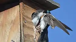 The tree swallow nests in structures with pre-existing holes, both natural and artificial. These were once found only in forested regions, but the building of nest boxes has allowed this bird to expand into open habitats.[6] This swallow usually nests in the area it bred the year before; only about 14% of females and 4% of males disperse to breed at a new site per year. Most do not go far, usually breeding at sites less than 10 kilometres (6.2 mi) away from their original grounds. Dispersal is influenced by breeding success; of the adult females that fail to fledge a chick, about 28% disperse, compared to 5% of successful breeders.[24] Natal dispersal (when a bird does not return to the site it was born at to breed) is common in the tree swallow and occurs more frequently than breeding dispersal.[28] It nests both in loose groups and isolated pairs. When nesting in loose groups, nests are usually spaced at least 10 to 15 metres (33 to 49 ft) apart,[12] and those that are closer in distance are usually further apart in terms of laying date.[29] In natural cavities, the tree swallow nests about 27 metres (89 ft) apart from its neighbor. The nest hole in these situations is, on average, 3.4 metres (11 ft) above ground level, although about 45% of them are less than 2 metres (6.6 ft) above the ground. Higher cavities are likely favoured because they reduce predation, while lower nest holes may be chosen to avoid competition. Entrance widths are often between 4 and 5 centimetres (1.6 and 2.0 in), whereas entrance heights are more variable: a 1989 study found openings ranging from 3.5 to 26 centimetres (1.4 to 10.2 in). Cavity volume is generally below 1,000 cubic centimetres (61 cu in).[30] After finding a suitable place to nest, the male perches near it and calls frequently. A lack of sites can cause fights between birds, sometimes resulting in deaths. This swallow usually defends an area around the nest with a radius of about 4.6 metres (15 ft),[6] as well as extra nests inside of that territory,[12] by blocking the entrance to the nest and chasing intruders.[6] The nest cup itself is made from grass, moss, pine needles, and aquatic plants collected mostly by the female,[12] and is lined with feathers gathered primarily by the male in fights.[31] The feathers may function to insulate the nest, decreasing incubation time[32] and likely preventing hypothermia in chicks. In addition to faster growth for chicks,[31] eggs cool slower in nests with feathers than those without.[33] However, a study published in 2018 did not find a significant correlation between the number of feathers in nests that were artificially warmed versus those that were not. Additionally, it found that nests in St. Denis, Saskatchewan used significantly less feathers than those in Annapolis Valley, despite the former being further north. However, temperatures in Nova Scotia (where Annapolis Valley is) are generally lower than those in Saskatchewan, possibly explaining the unexpected result.[34] Another hypothesis comes from research in the barn swallow, where feathers likely protect eggshells from bacteria,[35] although there are still negative effects of feather removal for already hatched tree swallows.[36]